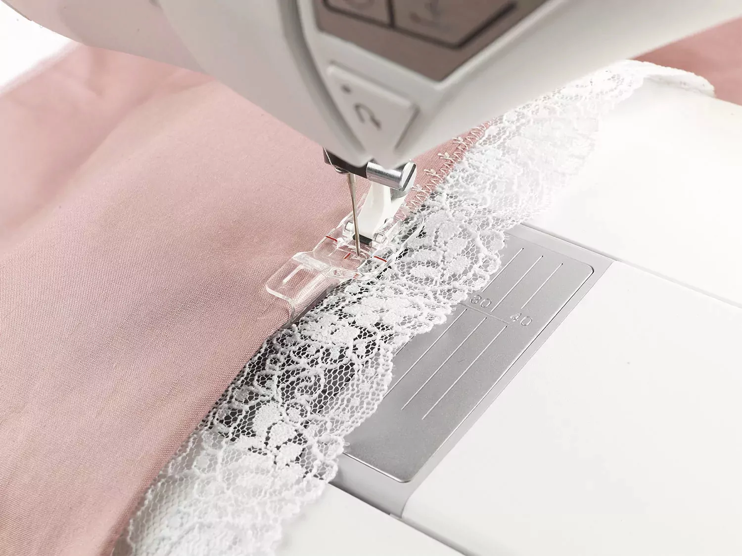 6. Sew carefully, not too fast. If your machine has a speed control, reduce the sewing speed to easily guide the fabric and edging as you sew. Hold the fabric in your left hand and the edging in your right hand and sew.